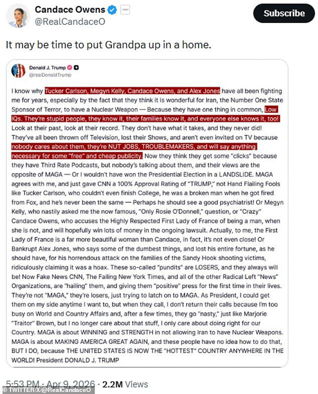 Then this past Thursday, Trump posted a 482-word screed on Truth Social calling all four podcasters “NUT JOBS,” “TROUBLEMAKERS,” and “stupid people” with “Low IQs” and “Third Rate Podcasts.” He attacked Tucker Carlson’s college attendance. He attacked Candace Owens’ appearance, saying the First Lady of France is “far more beautiful” than her. He dug up a question Megyn Kelly asked him at a debate in 2015. Jones he called “bankrupt.” And he concluded: “They’re not MAGA. They’re losers.”
