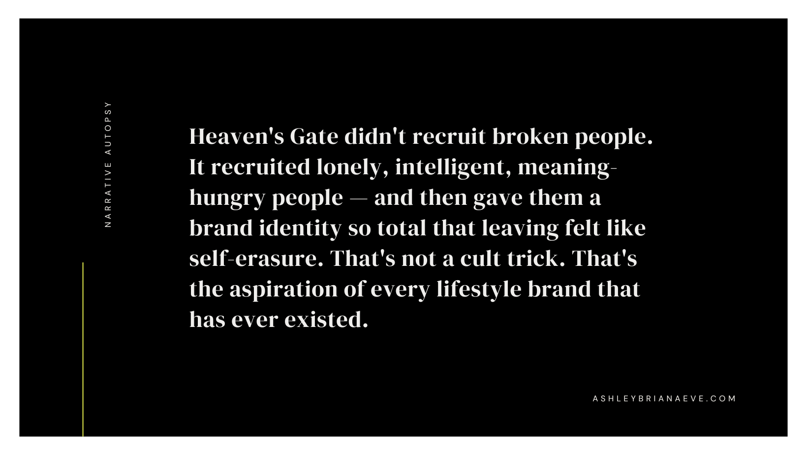Heaven’s Gate didn’t recruit broken people. It recruited lonely, intelligent, meaning-hungry people — and then gave them a brand identity so total that leaving felt like self-erasure. That’s not a cult trick. That’s the aspiration of every lifestyle brand that has ever existed.