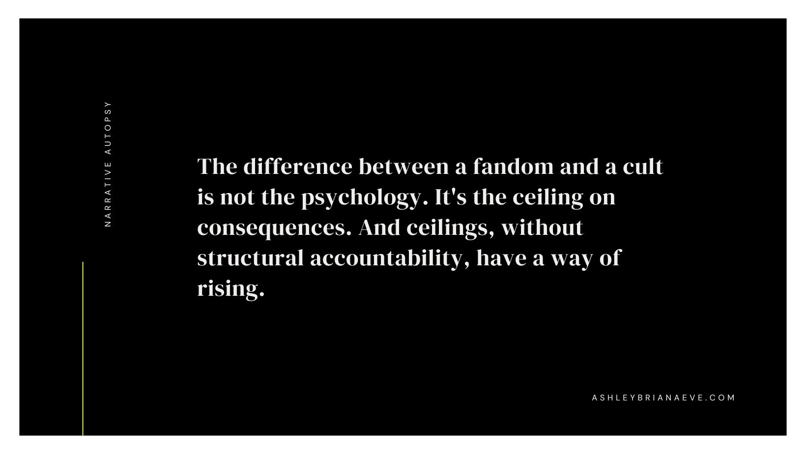 The difference between a fandom and a cult is not the psychology. It’s the ceiling on consequences. And ceilings, without structural accountability, have a way of rising.